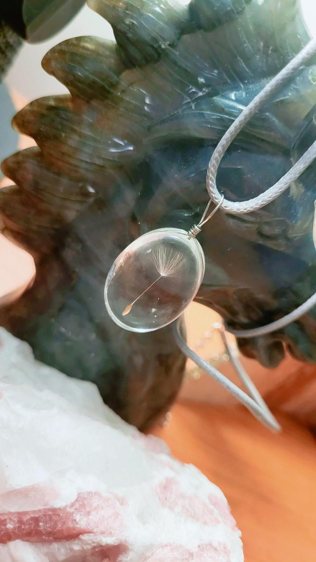 Dandelion seed set in resin. Comes on a grey waxed cotton cord with clasp.