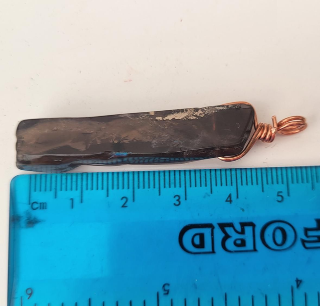 Hand wrapped with copper wire. Comes hanging on a length of grey faux leather cord.